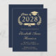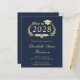 Modern budget-friendly dark navy blue college graduation announcement featuring "Class of" in a gold illustration of a laurel wreath incorporating a grad cap topper and diploma and the graduate's name in an elegant light gold script. Add their school, major, honours or future plans.