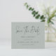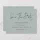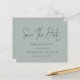 Budget Minimalist Script Light Sage Green Save The Date. A budget price SMALLER 4.5” x 5.6” alternative. Available in a SEMI-GLOSS 110 lb CARD STOCK which is similar in thickness to a postcard. There is ONE per sheet. Simple elegance with Save The Date in a modern set script.The rest of the text you can easily personalise.Shown here in black on Sage green however the text and background colours can be changed if you wish via the customise further option.
