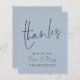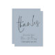 Budget Script New Mr Mrs Wedding Dusty Blue Thanks. A budget price SMALLER 4.5” x 5.6” alternative. Available in a SEMI GLOSS 110 lb CARD STOCK which is the default option (recommended for invitations), OR a SATIN FINISH 80 lb THINNER PAPER STOCK (ideal for enclosures). Envelopes are an optional extra and are slightly larger than the card size. Thanks and Mr & Mrs are set in an elegant handwriting style script on the front and the rest of the text on each side you can easily personalise with your names, and your thank you message for your guests. Can be changed to any colour of your choice via the customise further option.