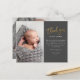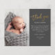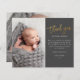 This modern photo thank you note features gold script thank you, personal message and a vertical photo on the front. The back includes a second baby photo that is a full bleed horizontal photo.