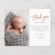 This modern photo thank you note features rose gold handwritten script thank you, personal message and a vertical photo on the front. The back includes a second baby photo that is a full bleed horizontal photo.