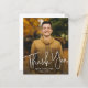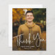 A Budget Script Photo Graduation Thank You Card with handwritten font full bleed portrait photo on the front with name and graduation details. The back has a second photo with a thank you message from the grad. Click the edit button to customise this design.