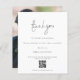 Script QR Code Wedding Photo Gallery Thanks. A budget price SMALLER 4.5” x 5.6” alternative. Available in a SEMI-GLOSS 110 lb CARD STOCK which is the default option (thicker for invitations), OR a SATIN FINISH 80 lb THINNER PAPER STOCK (ideal for enclosures). Envelopes are an optional extra and are slightly larger than the card size. A minimalist typography design with a set stylish handwriting style script for Thank You. On the back replace the sample picture with your own favourite from your day as a keepsake for your guests. Easily personalise the rest of the text with your message and names and replace the QR code sample with your own leading to your online wedding photo gallery.