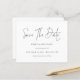 Script QR Code Wedding Save The Date. A budget price SMALLER 4.5” x 5.6” alternative. Available in a SEMI-GLOSS 110 lb CARD STOCK which is the default option (thicker for invitations), OR a SATIN FINISH 80 lb THINNER PAPER STOCK (ideal for enclosures). Simple elegance with Save The Date in a modern set script.The rest of the text you can easily personalise. With your QR code to your wedding website on the back. Shown here in black on white however the text and background colors can be changed if you wish via the customise further option.