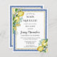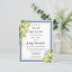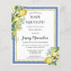 A She Found Her Main Squeeze Lemon Bridal Shower Theme is the perfect summer hen party. Refreshing and cool citrus fruit always create beautiful displays and refreshments. The Jenny's Lemons Collection takes chic watercolor lemons and pair them with Mediterranean blue tiles. In this design the tiles create a blue frame. A thin gold frame elevates it. Two lemon bouquets add a floral touch. She found her Main Squeeze is written at the top. The remainder of the hen party details follow.