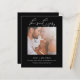 Budget She Said Yes Script Photo Black Engagement Announcement. A budget price SMALLER 4.5” x 5.6” alternative. Available in a SEMI-GLOSS 110 lb CARD STOCK which is the default option (thicker for invitations), OR a SATIN FINISH 80 lb THINNER PAPER STOCK (ideal for enclosures). A modern design to announce your exciting news, with an ornate set script with a heart swash for She Said Yes above your photo which is in square format and the rest of the text you can easily personalise. Choose a romantic photo of you both and replace the sample photo in the template placeholder with it. You can also change the white background on the front and back, via the Customise Further option if you wish, as well as the text colour to better match your chosen photo.
