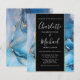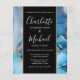Featuring signature style names, this elegant budget wedding invitation can be personalised with your information in chic lettering on a black and gold band and blue agate background. Designed by Thisisnotme©