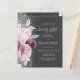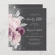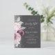 The left-hand edge of this elegant modern 50th anniversary party invitation features a mauve and dusty pink watercolor floral bouquet trimmed with silver foliage and faux silver glitter. The customizable text combines pale silver gray handwriting, copperplate and italic fonts on a charcoal gray background. The reverse side features a matching design.