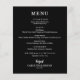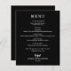 A dinner menu card on black features your menu in chic white lettering. Perfect for a modern wedding reception, wedding rehearsal dinner, anniversary party or any special event with a sit down dinner. Choose ANY COLOR BACKGROUND, any COLOR TEXT, any FONT! Easily personalise with your dinner menu and details.
