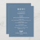 A small affordable, value paper slate blue dinner menu card with your food choices in chic white lettering is perfect for a modern wedding reception, wedding rehearsal dinner, anniversary party, or any special event with a sit-down dinner. *Measures 4.5" x 5.6" (or choose from 2 other sizes) printed on 110 lb. weight paper. Envelopes are available at an additional charge. The Live Design Service can help you with your design layout, size or adjust the colours if needed.