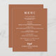 A terracotta dinner menu card with your food choices in chic white lettering. Perfect for a modern wedding reception, wedding rehearsal dinner, anniversary party or any special event with a sit down dinner. Measures 4.5" x 5.6" (or choose from 2 other sizes) printed on 110 lb. weight paper. Envelopes are an additional charge.