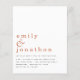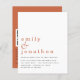 Simple Text QR Code Terracotta Wedding. A budget price SMALLER 4.5” x 5.6” alternative. Available in a SEMI-GLOSS 110 lb CARD STOCK which is the default option (thicker for invitations), OR a SATIN FINISH 80 lb THINNER PAPER STOCK (ideal for enclosures). Add your QR code to your wedding website on the back makes this a convenient option for your guests to RSVP and see all the details without the need for separate RSVP and details cards. Simple and. Informal, your first names are large in stylish lowercase in terracotta with the details beneath. Easily personalise the text. On the back is a coordinating terracotta.