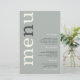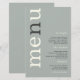 Simple Sage Ivory Typography Wedding Menu. A budget price size 5.5” x 8.5”, on an elegant 110 lb LINEN stock – for a luxury feel at great value, this is perfect for menus, as well as invitations and programs etc. This budget size alternative is also available in other paper choices. The SEMI-GLOSS 110 lb card stock is about the same thickness as a postcard, so also works well for invitations. The FELT 100 lbs paper is buff coloured, NOT white, so adds a rustic touch. The MATTE 80lbs paper stock is bright white, for crisp printing, great for your menus and programs, whilst the SATIN 80lbs paper is thin and lightA modern typographical design with Menu in large typography in Ivory with the ”n” in grey, rotated and to the left hand side on a background of light sage green. Background and text colours can be changed if you wish via Customise further.