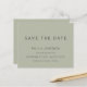 Simple Text Soft Sage Green Save The Date. A budget price SMALLER 4.5” x 5.6” alternative. Available in a SEMI-GLOSS 110 lb CARD STOCK which is the default option (thicker for invitations), OR a SATIN FINISH 80 lb THINNER PAPER STOCK (ideal for enclosures). Envelopes are an optional extra and are slightly larger than the card size. Simple elegance with Save The Date in a modern set script.The rest of the text you can easily personalise.Shown here in black on soft pale sage green however the text and background colours can be changed if you wish via the customise further option.