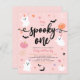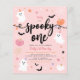 Spooky one cute ghost Halloween 1st birthday party invitation. Modern Halloween-themed design for a spooky party! This birthday invitation features spider's webs, ghosts, pumpkins, bats, spiders, leaves, candy corns, stars and daisies. This invite is great for little girls!