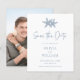 This modern minimal beach themed budget wedding save the date card has a white background with dusty blue text, two starfish at the top, and trendy handwriting script calligraphy, with a photo template on the back.