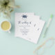 This modern minimal beach wedding invitation has a white background with navy blue text, two starfish at the top, and trendy handwriting script calligraphy. The back is navy blue.
