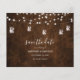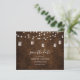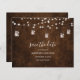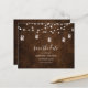 Beautiful dark wood with string lights and mason jars wedding save the date card. The mason jars have tiny hearts in them as well as lights. The hand-lettered script typography looks amazing,