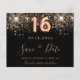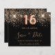 A girly and trendy Save the Date for a Sweet 16, 16th birthday party. A black background decorated with faux gold glitter. Templates for a date and name and text. Golden coloured letters. The text: Save the Date is written with a large trendy hand lettered style script.