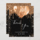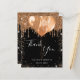 A Sweet 16, birthday thank you card. A chic black background colour. With faux gold glitter drips, paint dripping look and balloons. On front large hand lettered script and the text: Thank You, your text, title and a date.