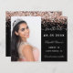 On front: Add a vertical size photo. A black background colour, decorated with rose gold faux glitter dust. Personalise and add a name and details.