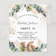 For a Sweet 16, 16th birthday party. A white background decorated with eucalyptus greenery and golden leaves. Golden faux glitter spots. Personalise and add your names and wedding details. Black and golden coloured letters. Number 16 is written with balloon style font.
