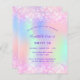 A girly and feminine Sweet 16, 16th birthday party invitation. On front: A rainbow, holographic coloured background in purple, pink, mint green, rose gold. Decorated with blush pink faux glitter, sparkles. Personalise and add a name and party details. The name is written with a hand lettered style script, purple coloured letters.