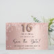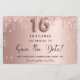 A girly and trendy Save the Date card for a Sweet 16, 16th birthday party. Rose gold faux metallic looking background decorated with rose gold and faux silver glitter drips and dust. Personalise and add a date and name/text. The text: Save the Date is written with a large trendy hand lettered style script with swashes. Number 16 with a balloon style font.