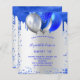 A girly and feminine Sweet 16, 16th birthday party invitation. On front: A faux silver background. Decorated with royal blue faux glitter drips, paint dripping look and balloons. Personalise and add a name and party details. The name is written with a hand lettered style script.