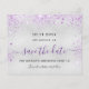 A girly and trendy Save the Date for a Sweet 16, 16th birthday party. A modern faux silver metallic looking background decorated with purple faux glitter dust. Personalise and add a date and name/age. Black and purple coloured letters. The text: Save the Date is written with a large trendy hand lettered style script.