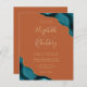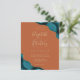 A teal blue watercolor agate design trimmed with faux gold glitter appears in two corners of this elegant design. Personalise it with the couple's names in gold-coloured handwriting script over a large ampersand. Add the wedding details in gold-coloured copperplate and italic fonts on a burnt orange or rust background. The reverse side provides space for wedding details on a solid burnt orange background, along with a QR code guests can scan to visit your website and RSVP.