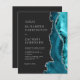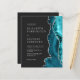 The right edge of this elegant modern wedding invitation features a teal blue watercolor agate border trimmed with faux silver glitter. The customisable text combines silver grey serif, copperplate and italic fonts on a slate black background. The reverse side provides space for wedding details on a solid slate black background, along with a QR code guests can scan to visit your website and RSVP, which saves the cost of printing and mailing separate RSVP cards.
