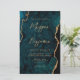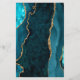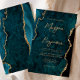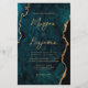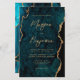 This elegant wedding invitation features a background image of teal blue watercolor agate trimmed with faux gold glitter. The customisable text combines gold-coloured modern handwriting, copperplate and italic fonts. The reverse side features a coordinating teal and gold agate design.