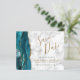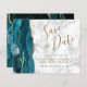 This elegant budget save the date card features a teal blue watercolor agate border trimmed with faux gold glitter. The customisable text combines black and gold-coloured handwriting script, copperplate and italic fonts on a grey and white marble background. The reverse side features a matching teal and gold agate design.