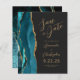 The left-hand edge of this elegant modern wedding save the date card features a teal blue watercolor agate border trimmed with faux gold glitter. The customisable text combines gold-coloured script and sans serif fonts on a slate black background. The reverse side features a matching teal and gold agate design.