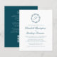 This elegant wedding invitation design features a teal blue script monogram initial encircled by a line art botanical wreath. The names appear in teal script, with the rest of the text in classic serif font. The reverse side provides space for wedding details on a solid teal blue background, along with a QR code guests can scan to visit your website and RSVP.