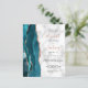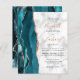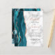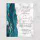 The left-hand edge of this elegant modern wedding invitation features a teal blue watercolor agate border trimmed with faux rose gold glitter. The customisable text combines dusty rose handwriting with black copperplate and italic fonts on a grey and white marble background. The reverse side features a matching teal and rose gold agate design.
