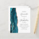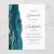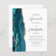 The left-hand edge of this elegant modern wedding invitation features a teal blue watercolor agate border trimmed with faux rose gold glitter. The customisable text combines charcoal grey script and sans serif fonts on a white background. The reverse side provides space for wedding details on a solid white background, along with a QR code guests can scan to visit your website and RSVP, which saves the cost of printing and mailing separate RSVP cards.