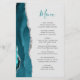 The left-hand edge of this elegant modern wedding menu features a teal blue watercolor agate border trimmed with faux silver glitter. The customisable text combines teal blue handwriting script with charcoal grey copperplate font on a pale grey background. The reverse side features a matching teal and silver agate design.