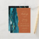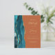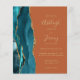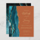 The left-hand edge of this elegant modern wedding invitation features a teal watercolor agate border trimmed with faux gold glitter. The customisable text combines gold-coloured handwriting, copperplate and italic fonts on a burnt orange background. The reverse side features a matching teal and gold agate design.