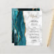 The left-hand edge of this elegant modern wedding menu features a teal blue watercolor agate border trimmed with faux gold glitter. The customisable text combines gold-coloured handwriting script with black copperplate font on a grey and white marble texture background. The reverse side features a matching teal and gold agate design.