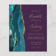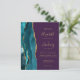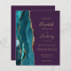 The left-hand edge of this elegant modern wedding invitation features a teal watercolor agate border trimmed with faux gold glitter. The customisable text combines gold-coloured handwriting, copperplate and italic fonts on an opulent deep purple background. The reverse side provides space for wedding details on a solid purple background, along with a QR code guests can scan to visit your website and RSVP, which saves the cost of printing and mailing separate RSVP cards.