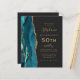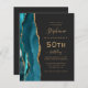 The left-hand edge of this elegant modern 50th birthday party invitation features a teal blue watercolor agate border trimmed with gold faux glitter. The customisable text combines gold-coloured handwriting, copperplate and italic fonts on a slate black background. Add RSVP instructions on the back of the card, along with a QR code guests can scan to respond online.