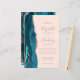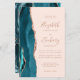The left-hand edge of this elegant modern wedding invitation features a teal watercolor agate border trimmed with faux rose gold glitter. The customizable text combines handwriting, copperplate and italic fonts in dusty rose on a blush pink background. The reverse side features a matching teal and rose gold agate design.