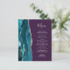The left-hand edge of this elegant modern wedding menu features a teal blue watercolor agate border trimmed with faux silver glitter. The customisable text combines silver grey handwriting script and copperplate fonts on a purple background. The reverse side features a matching teal and silver agate design.