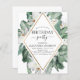 Budget Tropical Magnolia Flowers with Floral Greenery Palm and Faux Gold Foil Geometric Border Spring or Summer Any Age Birthday Party Invitations - includes beautiful and elegant script typography with modern tropical botanical flowers and greenery for the special 13th, 15th, 16th, 18th, 30th, 40th, 50th, 60th, 70th, 80th, 90th, 100th birthday party.