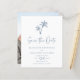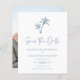 This budget wedding save the date card has a simple minimal tropical beach themed design with two palm trees at the top, in a white and dusty blue colour scheme, with a photo template on the back.