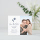 This elegant navy blue tropical beach wedding BUDGET save the date card features two palm trees above the text, stylish handwriting script for the “Save the Date” announcement, and a photo of the happy couple.