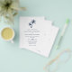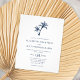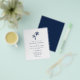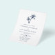 This budget coastal wedding invitation is a smaller size printed on cheaper paper, without an envelope. The simple minimal tropical beach wedding invitation features two palm trees at the top, with classic elegant text, in a white and navy blue colour scheme, with coordinating navy blue on the back.