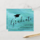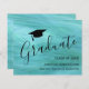 This modern graduation announcement features a graduation cap on a turquoise background.